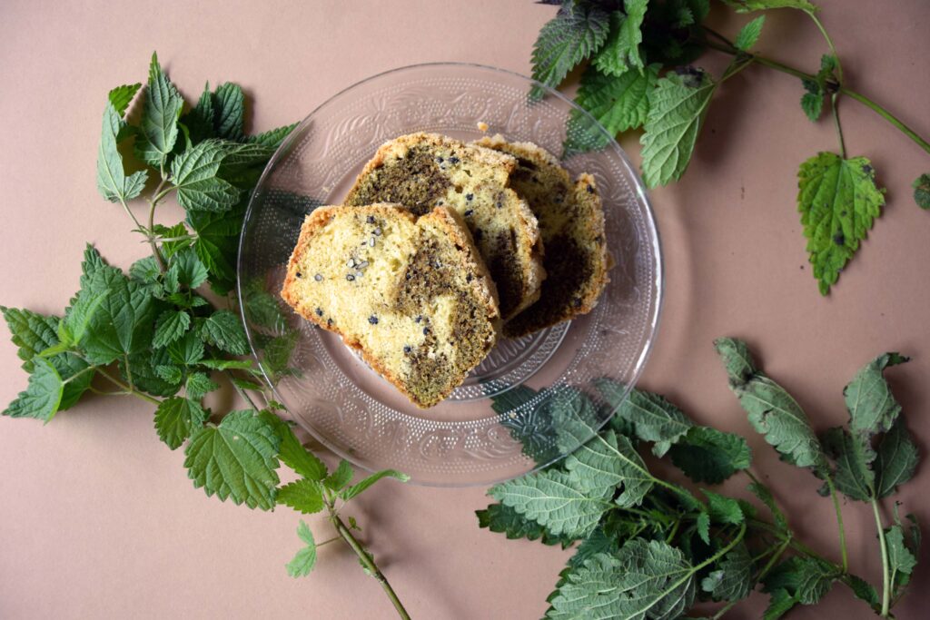 Razmišljal sem, da bo seme še najlepše prišlo do izraza v – semenskem kolaču. Pobrskal sem za receptom za tradicionalni angleški seed cake (na spletu jih mrgoli; ta kolač navadno odišavijo s kumino) in ga po svoje priredil, če hočete: podivjinil. Testo sem razdelil na dva dela, enemu primešal nedotikino seme, drugemu pa poleg koprivnega še kakšno žlico posušenih, v prah zmletih koprivovih listov za vpadljiv zeleno-rumen marmoriran kontrast. Nisem si mogel kaj, da ne bi zelene polovice okrepil še s kakšno žličko japonskega zelenega čaja v prahu, matče, ki sem ga imel pri roki. Nasploh med njim in mletimi koprivami zaznavam nekakšno aromatično sorodnost ali afiniteto, saj se tudi kopriva lepo izrazi v sladicah, čeprav velikokrat nima ravno živosti čajeve zelenine. (To dejstvo mi je pravzaprav pred leti iz podzavesti priklicala lastnica fascinantnega lokala na Dunaju, v katerem je ponujala nabrano zelenjavo in vse mogoče jedilne pripravke na osnovi samoniklega rastlinskega bogastva, medtem ko sem z radovednostjo pokušal njeno koprivno marmelado. »Ja,« se je navduševala, »koprive so naš zeleni čaj!«)