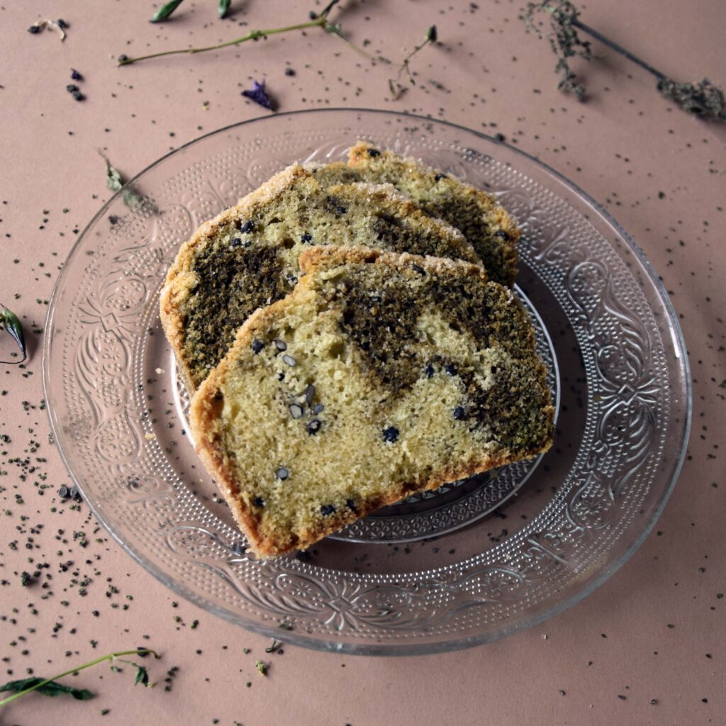 Torej tako, stenografsko: 175 g zmehčanega masla stepem z enako količino sladkorja, gladko primešam tri jajca, v zmes presejem 225 g moke, žličko sode bikarbone in ščep soli in skupaj z žlico mleka premešam v gladko testo. Razdelim na dva dela in vmešam semena in listni prah. Po dnu modla za peko izmenično polagam žlico enega in žlico drugega. Ko porabim vse testo, ga zravnam, potem pa s kakšno palčko, s katero sežem vse do dna modla, pošarim po njem, da ga marmoriram. Po vrhu posujem še malo kristalnega sladkorja, ki bo staljen ustvaril hrustljavo skorjico. Pečem od 45 do 55 minut na 180 stopinjah.