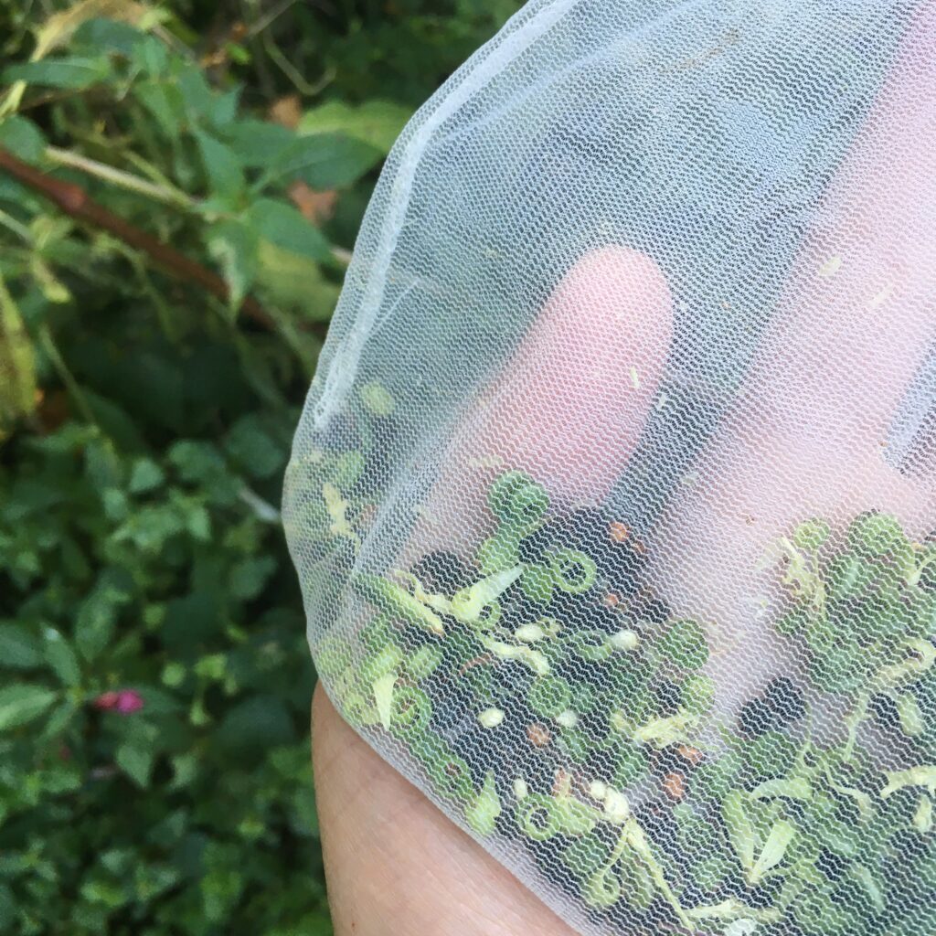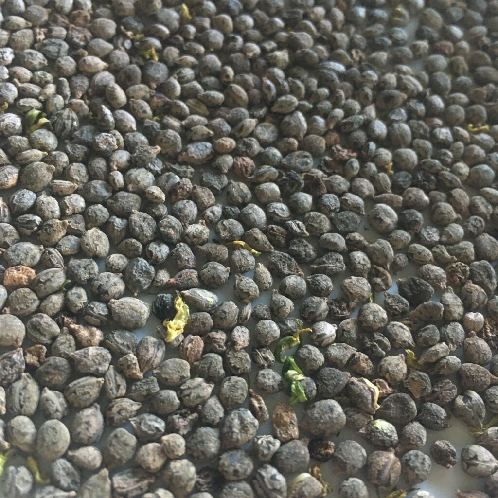Od kod naši nestrpni invazivki ime, nam postane jasno, čim odločneje zakoračimo v njeno bližino: zasuje nas pršec semen, ki so že komaj čakala, da se kaj dotakne njihovih napetih bivališč in lahko poletijo v svobodo (nepripravljen človek pomisli, da je nehote zmotil roj manjših kobilic ali podobnih skakajočih bitjec). Ker, kot smo se poučili, nedotikinim semenom le ni priporočljivo privoščiti preveč svobode, jih verjetno še najkoristneje onemogočimo tako, da jih pojemo. Da nam pri nabiranju ne uidejo, čez rastlino poveznemo vrečko (meni se obnesejo tiste prosojne mrežaste za sadje in zelenjavo za večkratno uporabo) in jo malo potresemo, manj nestrpnih plodov pa se tudi nežno dotaknemo (iz teh bojo padla skoraj bela semena). Tako bomo v vrečko poleg semena ujeli tudi nekaj listkov, pecljev in predvsem zelenih »polžkov«, uvitih režnjev plodu, zato bo treba ločiti zrnje od plev. To nam še najlažje uspe, če ulov razprostremo po ravni podlagi in ga za nekaj dni namestimo na radiator; iz zelenih delov izhlapi voda in postanejo lažji od semena, zato jih zdaj lahko odstranimo s pihanjem (najbrž temu lahko rečem planje). Za nameček tako izzveni še neprijetni vonj. Ostane nam seme, ki ima zdaj bolj ali manj enakomerno sivkasto-črnikasto barvo, prijetno hrustljavo teksturo in blag oreškast okus.