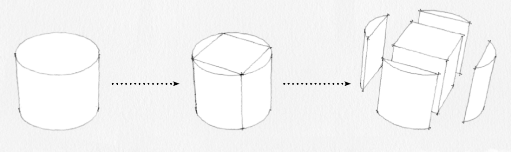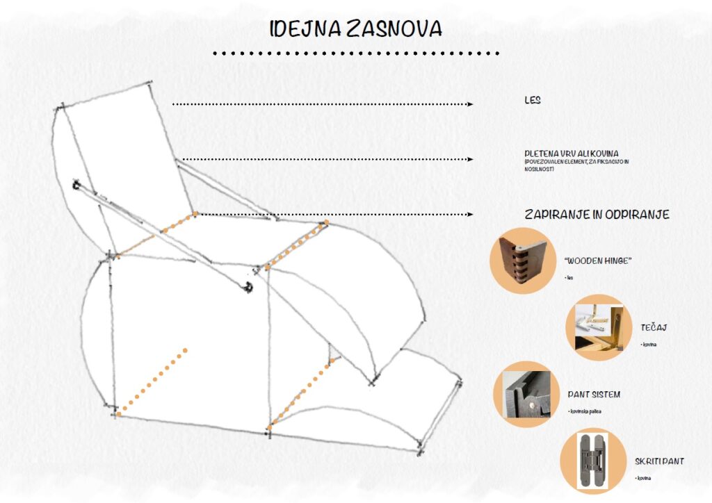 Avtorica izhaja iz dejstva, da je na posestvu moč najti odpadni les. Predlaga, da se debele čoke očisti, osuši in zbrusi, nato pa se valjasti obliki, ki jo s tem dobimo, odrežejo štirje enaki kosi. Ti se z osnovnim kvadrom povežejo s stikom, podobnim pantu, ki omogoča odpiranje in zapiranje. Na ta način dobimo zanimiv objekt, ki prek odpiranja posameznih ‘kril’ omogoča raznolike načine uporabe. avtorica predvidi uporabo kot počivalni stol, gugalnik, mizica ali večnamensko igralo.