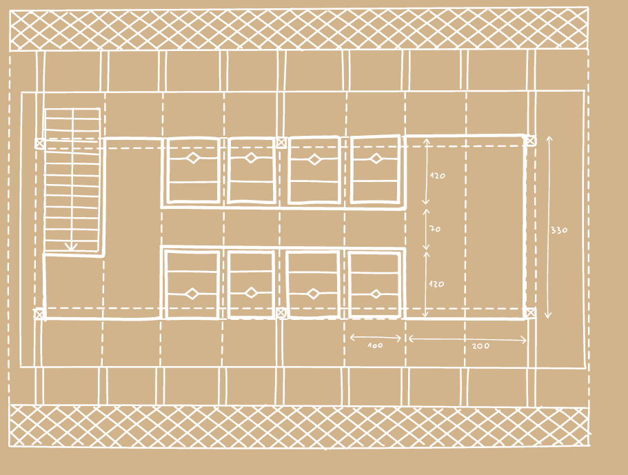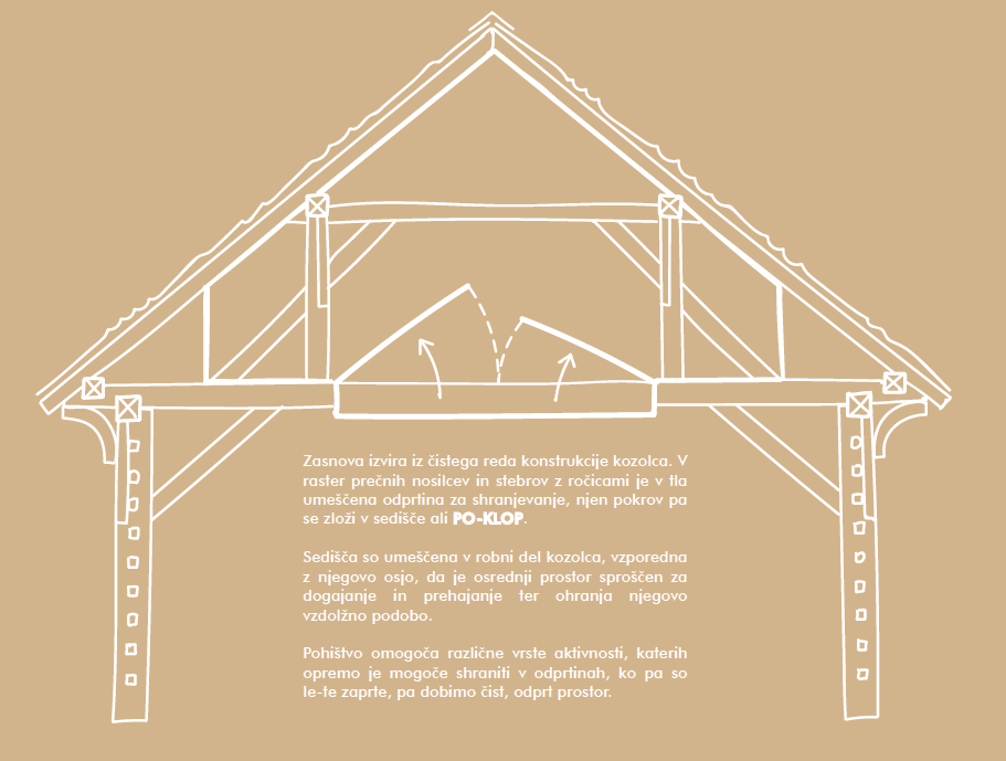 Idejni projekt za intervencijo v kozolec toplar Matevža Dražumeriča je nastal na oblikovalskem izzivu 1498/2022 na domačiji pr’ Lenart na Belem. Avtor razvije sistem loput v tleh kozolca, ki se po potrebi spremenijo v klopi.