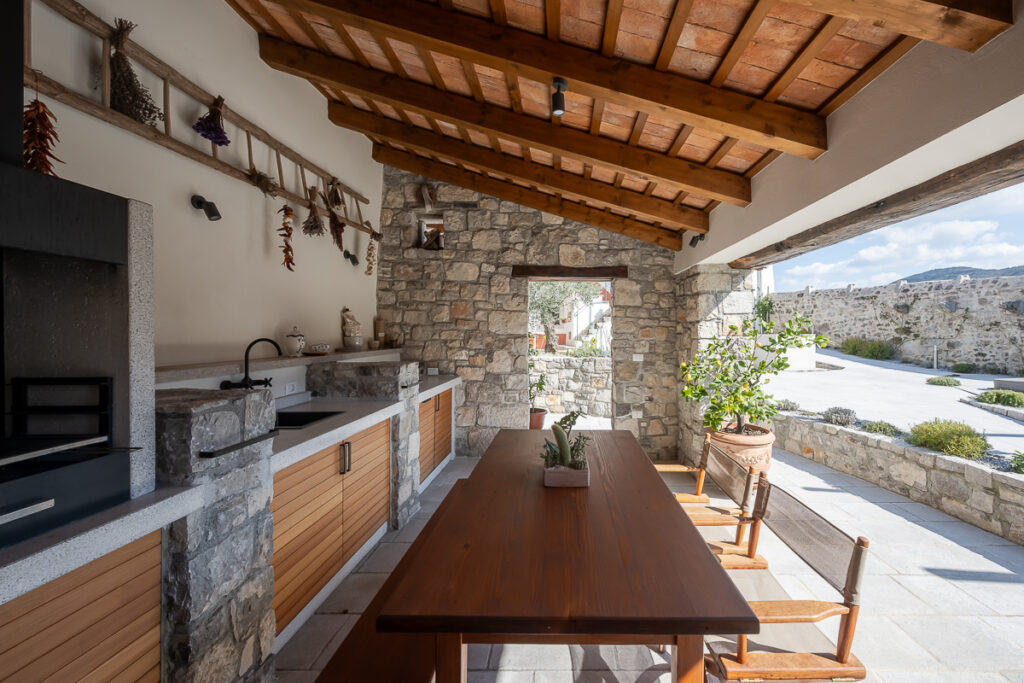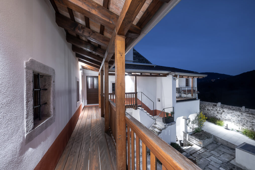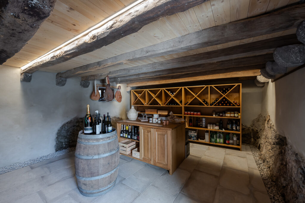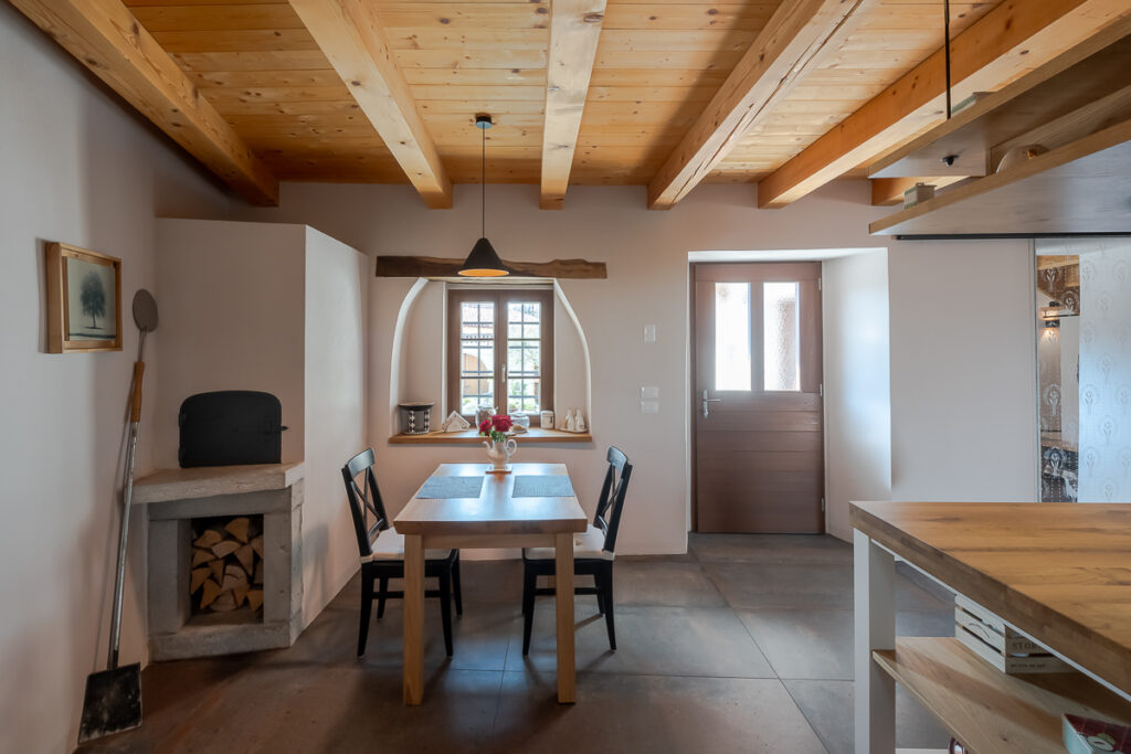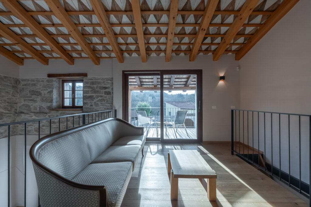 Nekdanja gospodarska poslopja so danes postala deli večje stanovanjske hiše: v svinjaku najdemo letno kuhinjo, v hlevu spa s savno, v skednju pa vežo z garderobo in novo vertikalno povezavo – stopniščem. V hlevu je arhitektka domiselno ohranila dva zanimiva detajla: na ohranjenih kamnitih jaslih je danes ležalna površina, voda iz savne pa odteka po nekdanjem kanalu za odplake, ki je bil namenjen čiščenju hleva. Zgornji prostori so namenjeni spanju, do njih pa vodi že omenjeno novo notranje stopnišče. Kljub temu, da z izjemo lesenih podpornih konzol gank ni bil v primernem stanju za ohranitev, ga je uspelo rekonstruirati in s tem obnoviti značilno podobo kraške domačije.