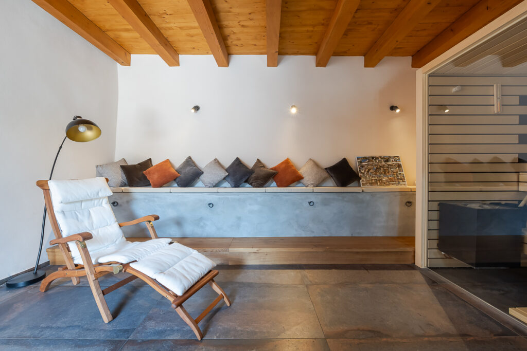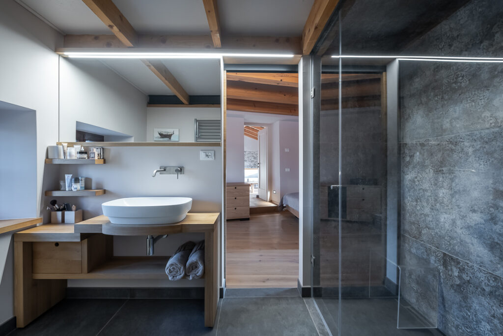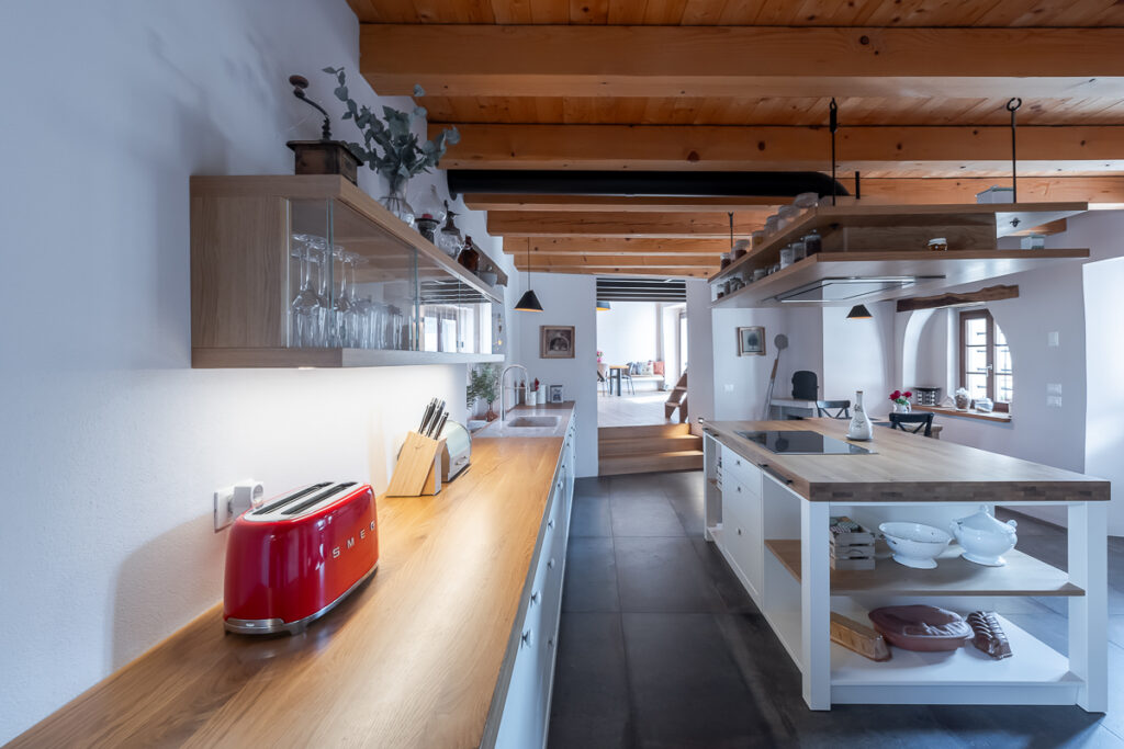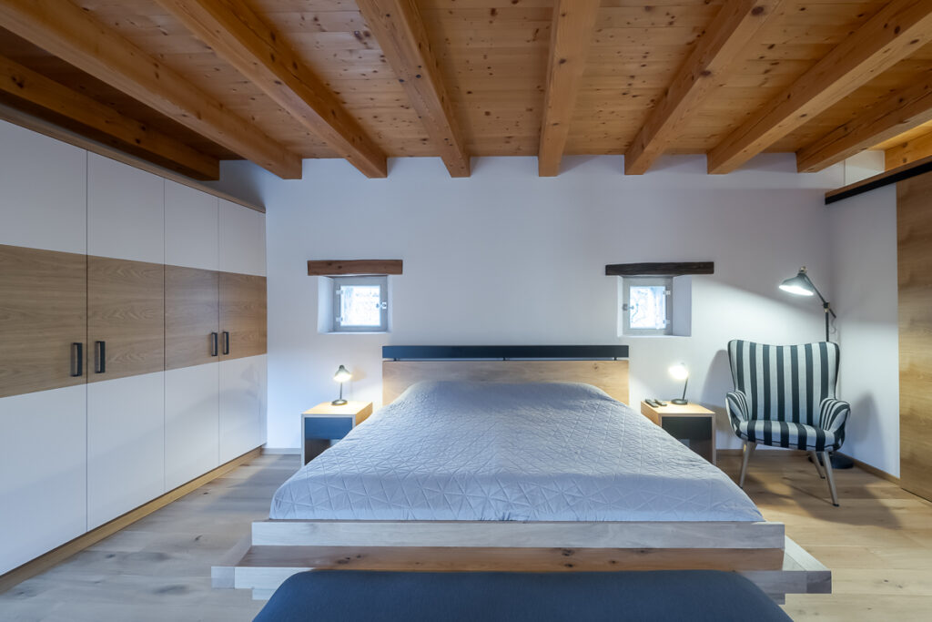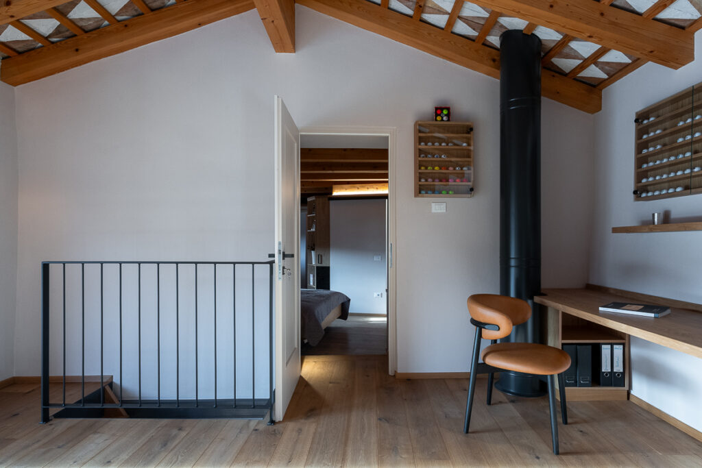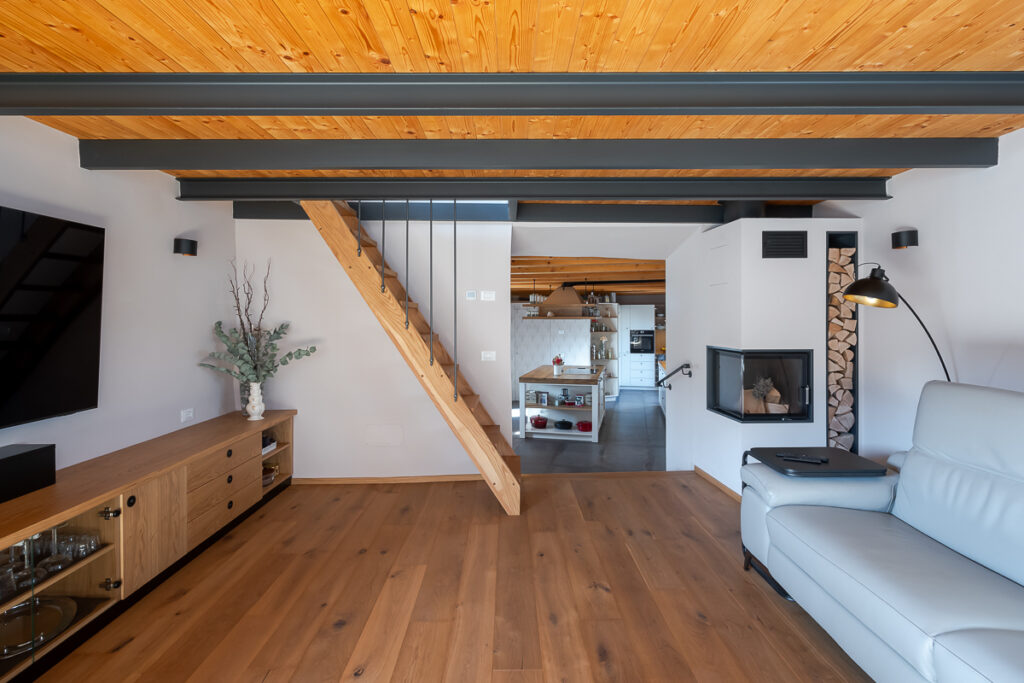 Nekdanja gospodarska poslopja so danes postala deli večje stanovanjske hiše: v svinjaku najdemo letno kuhinjo, v hlevu spa s savno, v skednju pa vežo z garderobo in novo vertikalno povezavo – stopniščem. V hlevu je arhitektka domiselno ohranila dva zanimiva detajla: na ohranjenih kamnitih jaslih je danes ležalna površina, voda iz savne pa odteka po nekdanjem kanalu za odplake, ki je bil namenjen čiščenju hleva. Zgornji prostori so namenjeni spanju, do njih pa vodi že omenjeno novo notranje stopnišče. Kljub temu, da z izjemo lesenih podpornih konzol gank ni bil v primernem stanju za ohranitev, ga je uspelo rekonstruirati in s tem obnoviti značilno podobo kraške domačije.