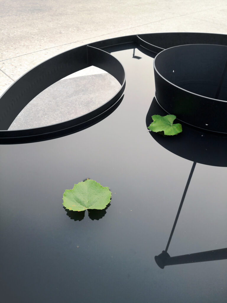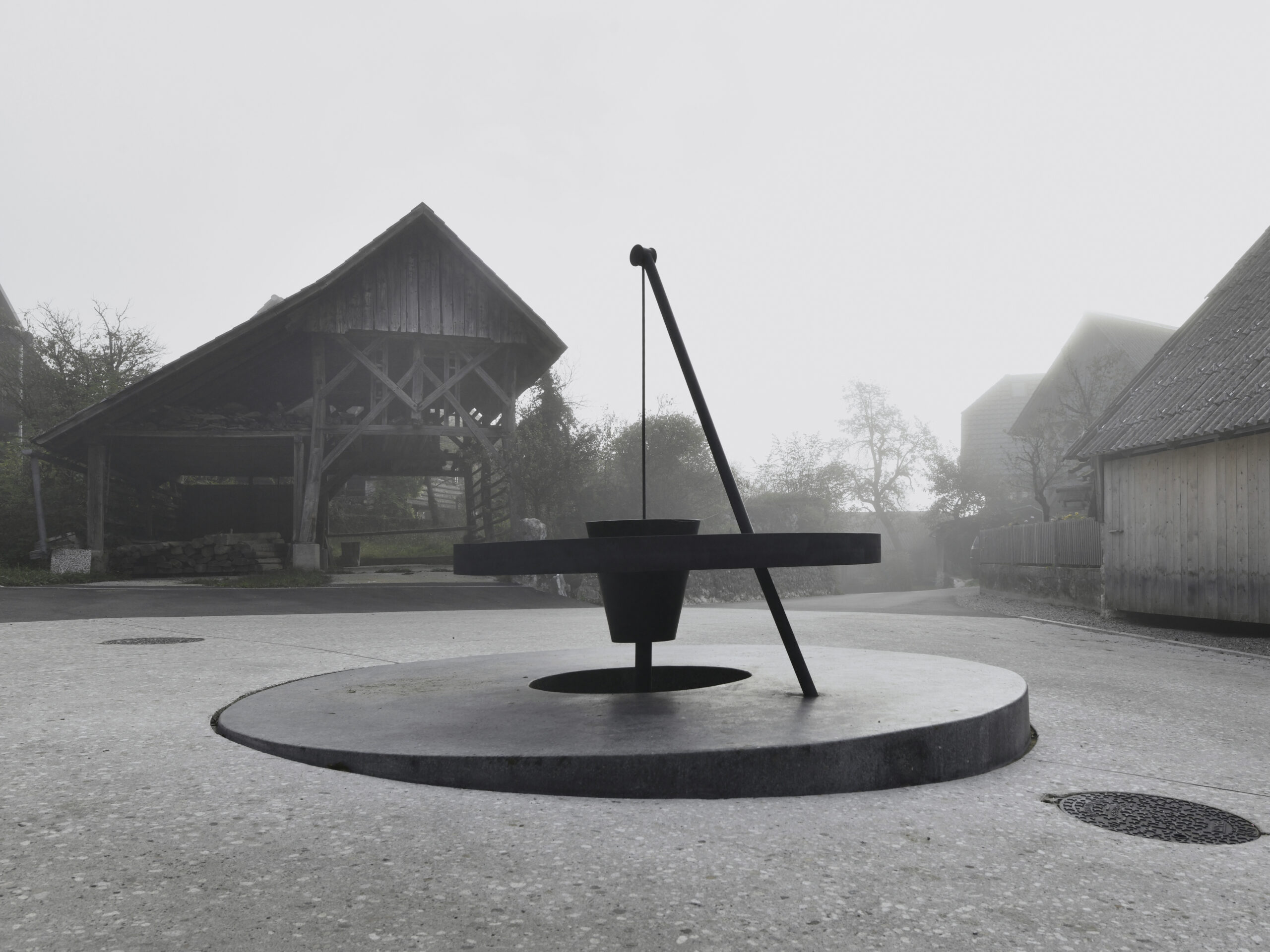 Nova intervencija je namerno minimalistična, meditativna. Nad odprtino lebdi tanka črna krožna površina, kot sodoben odmev vedra, kakršnega so nekoč spustili, da bi zajeli vodo. Njena odsevna površina ujame spreminjajoče se alpsko nebo, meglo doline, bežne premike svetlobe. Iz središča se v kamniti jašek spušča vitka žareča palica, ki osvetljuje tako ritem padajočih kapljic kot globino minevajočega časa. Instalacija ne dominira, temveč vabi. Praznino uokvirja kot aktivno prisotnost – prostor premora in spomina v merilu vasi.