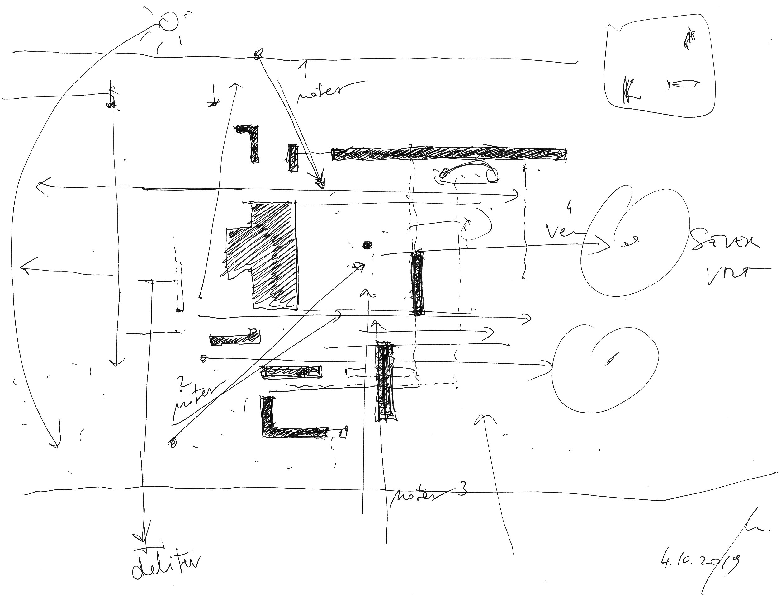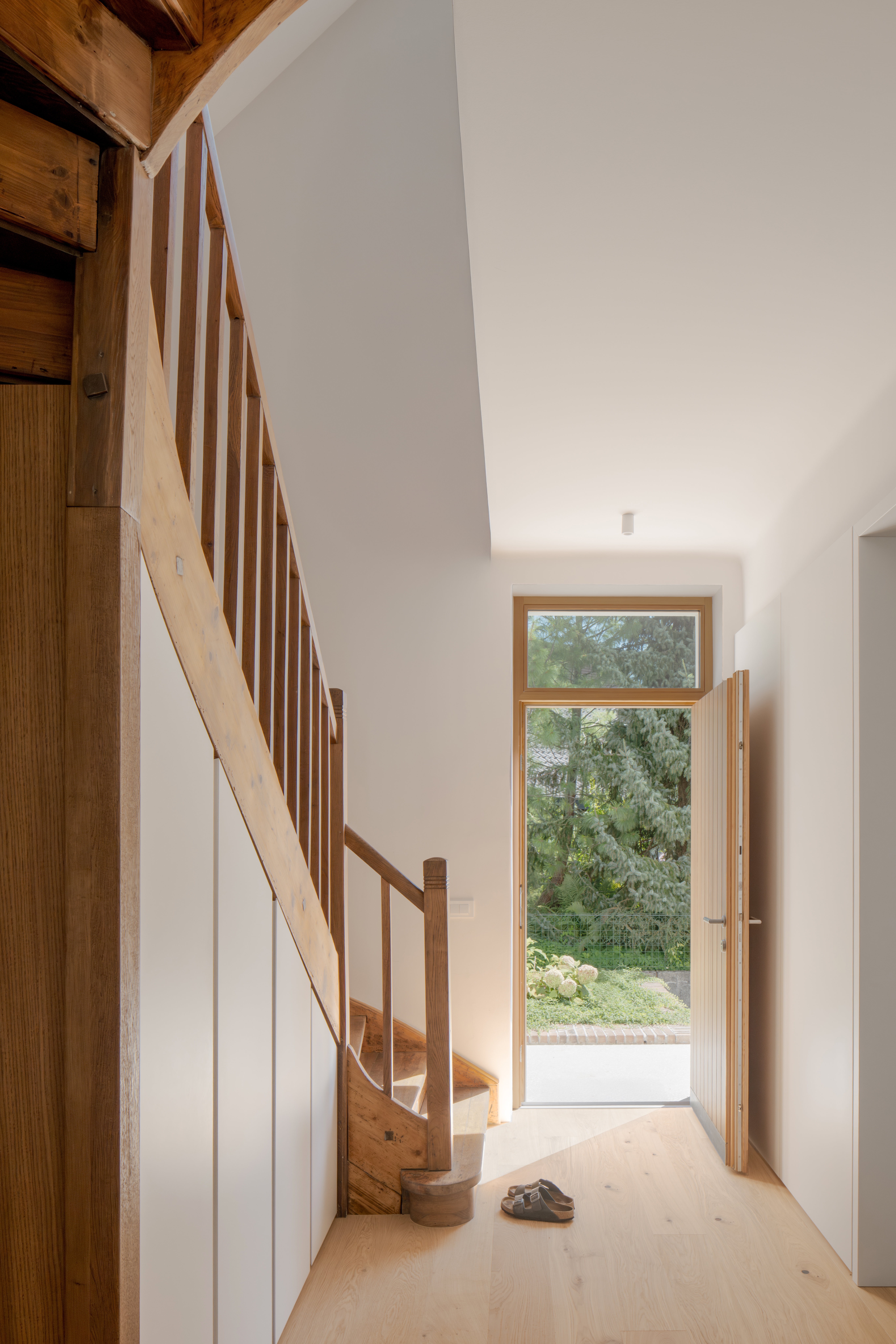 Eden zmed redkih izvirnih elementov hiše je bilo staro stopnišče, ki je tudi po prenovi ostalo pomemben nosilec identitete prostora. Okoli te vertikalne prostorske osi se zavrtijo poti, preboji in pogledi – vsi v smiselnih linijah, ki dopuščajo počasna potovanja skozi plasti prostora. Čez prizidek se, kot je edino prav, širi terasa, od živahnejšega parterja odmaknjen in miren otok z razgledi širom Rožne doline.